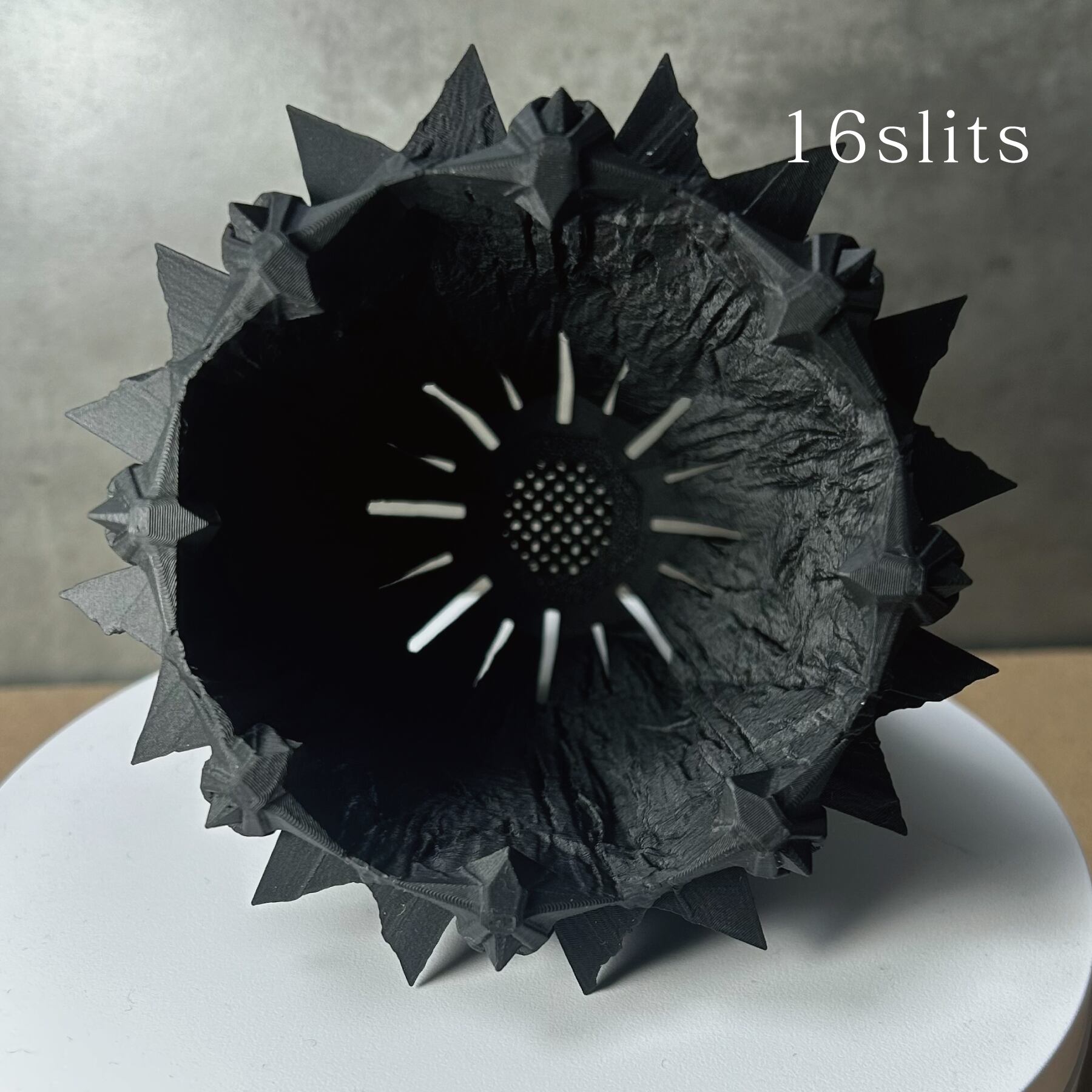アガベなどの生育を考慮し、大きめのスリットを配置。高い排水性を確保すると同時に、スリットから覗く用土の乾き具合を視覚的に把握できるという、実践的な気づきから生まれた設計です。