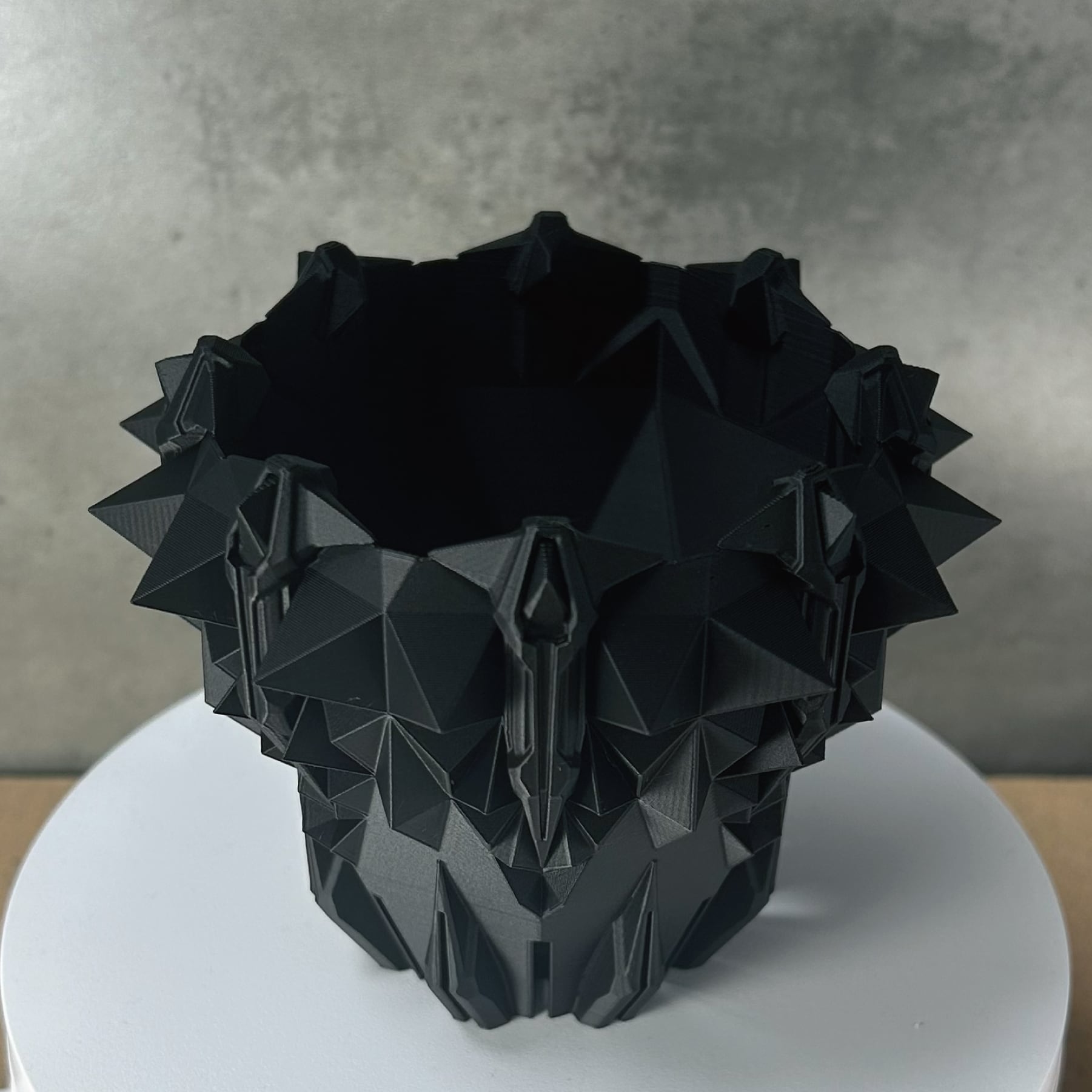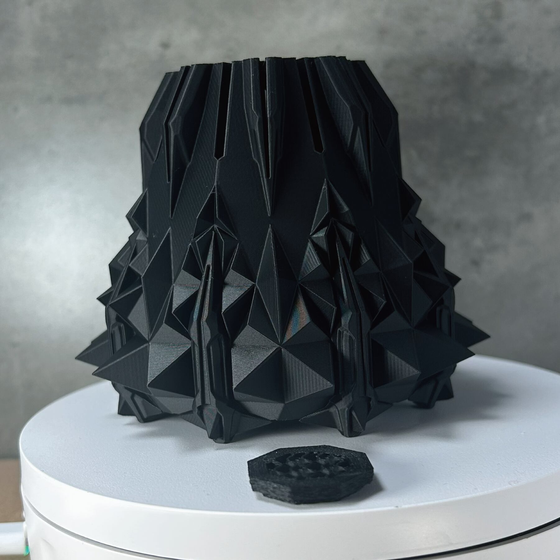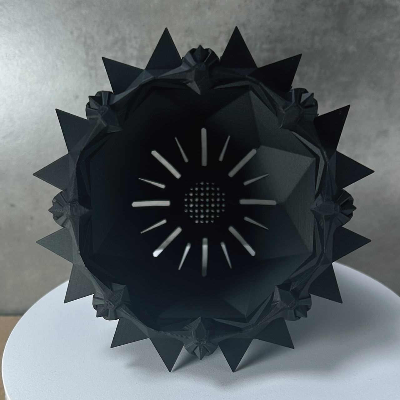 コンセプトは「鉱物の結晶を、悪魔の爪が握りしめている」情景。無機質で秩序ある8角形の結晶体を、有機的で混沌とした悪魔の爪がその内に封じ込める。その激しい拮抗と融合が生み出す、圧倒的な緊張感。鋭利なディテールに指先で触れることで、この3Dプリンター作家鉢が単なる器ではないことを理解するでしょう。暴力的ながらも計算され尽くした造形は、そこに植えられた植物の生命力を、より一層際立たせます。
