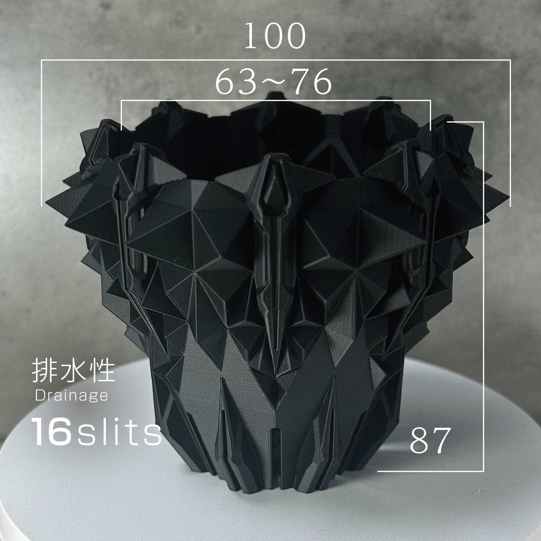 特徴: 悪魔と結晶のハイブリッドデザイン、砕(表面に砕かれたようなテクスチャを使用)、排水・通気性に優れた大型スリット(土壌確認窓)