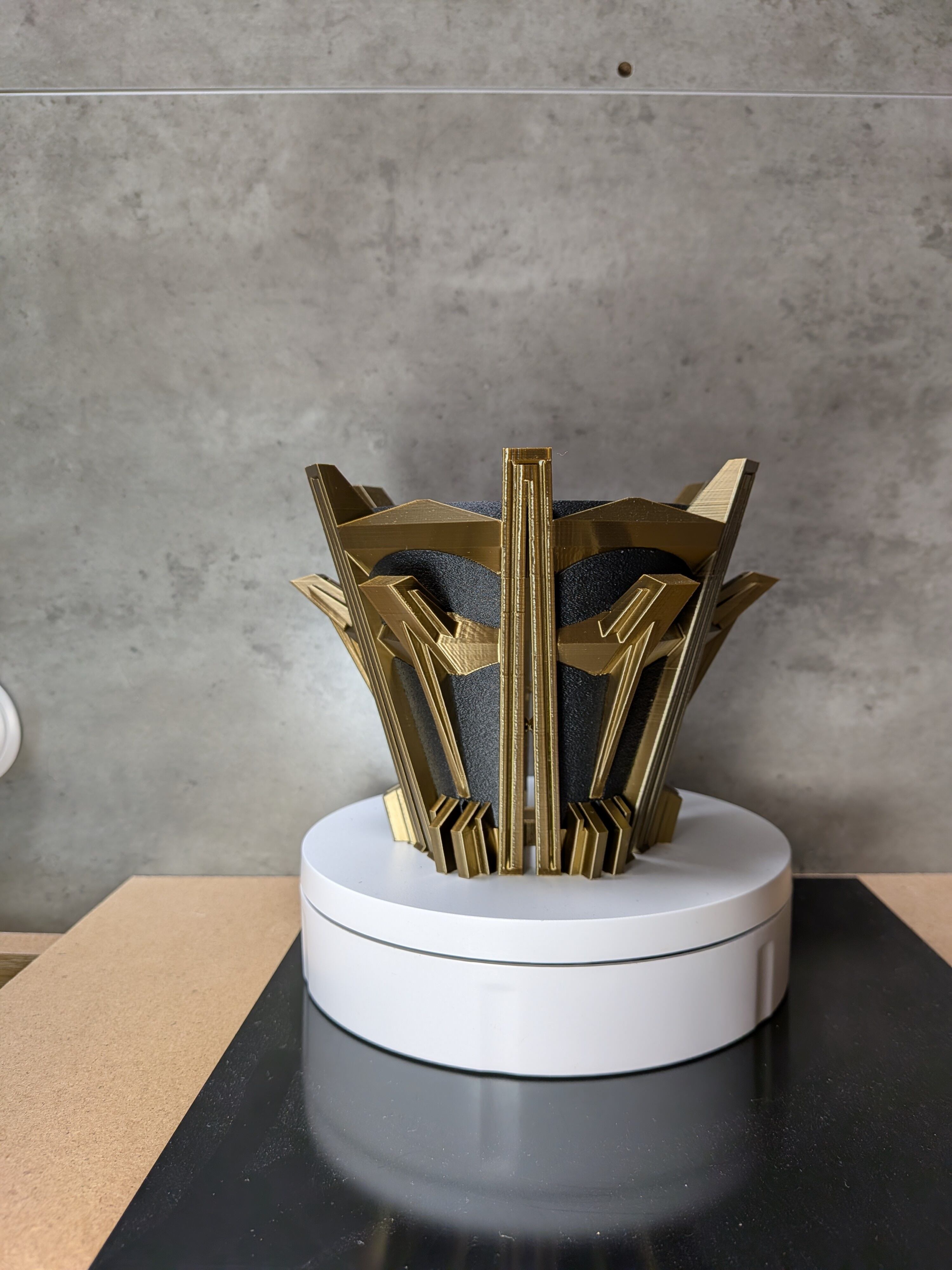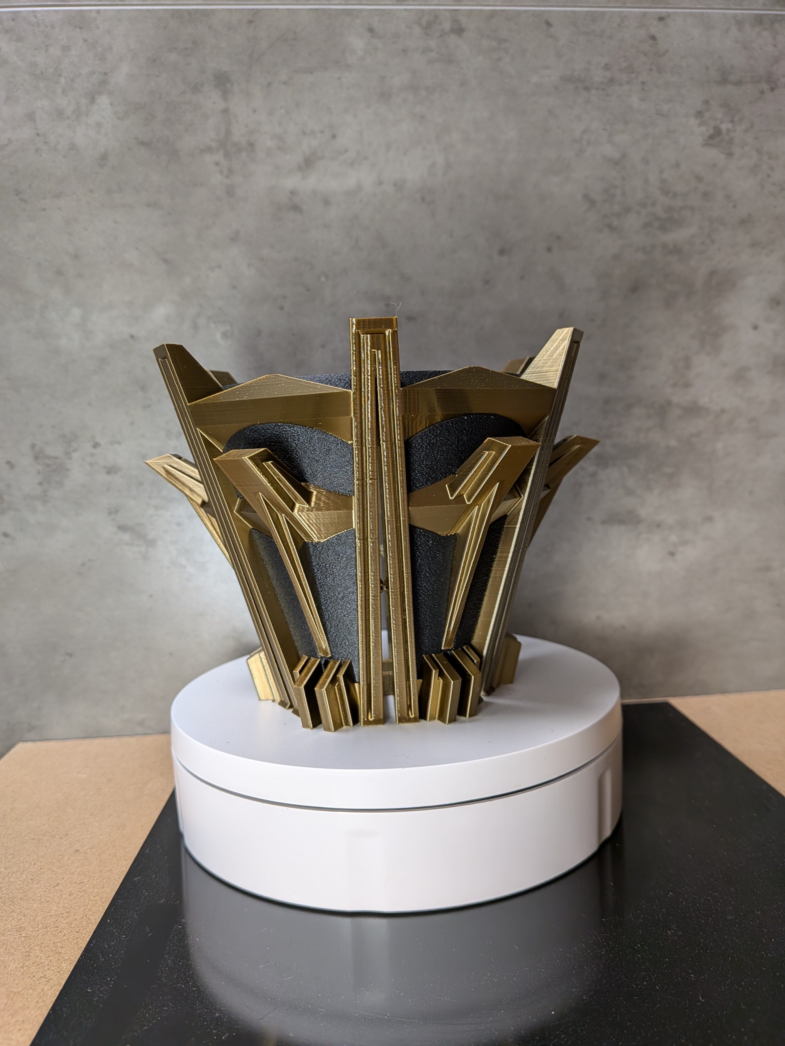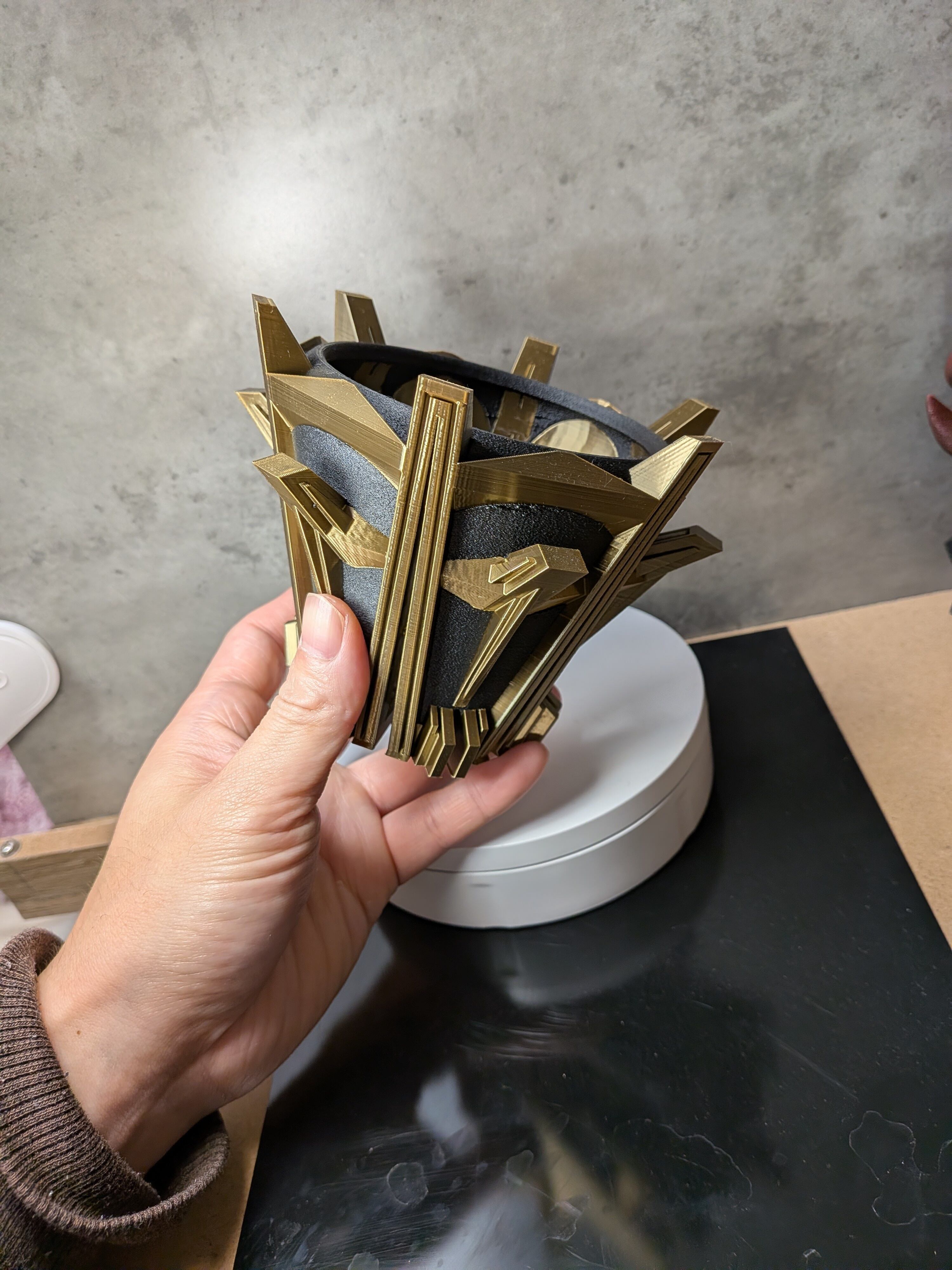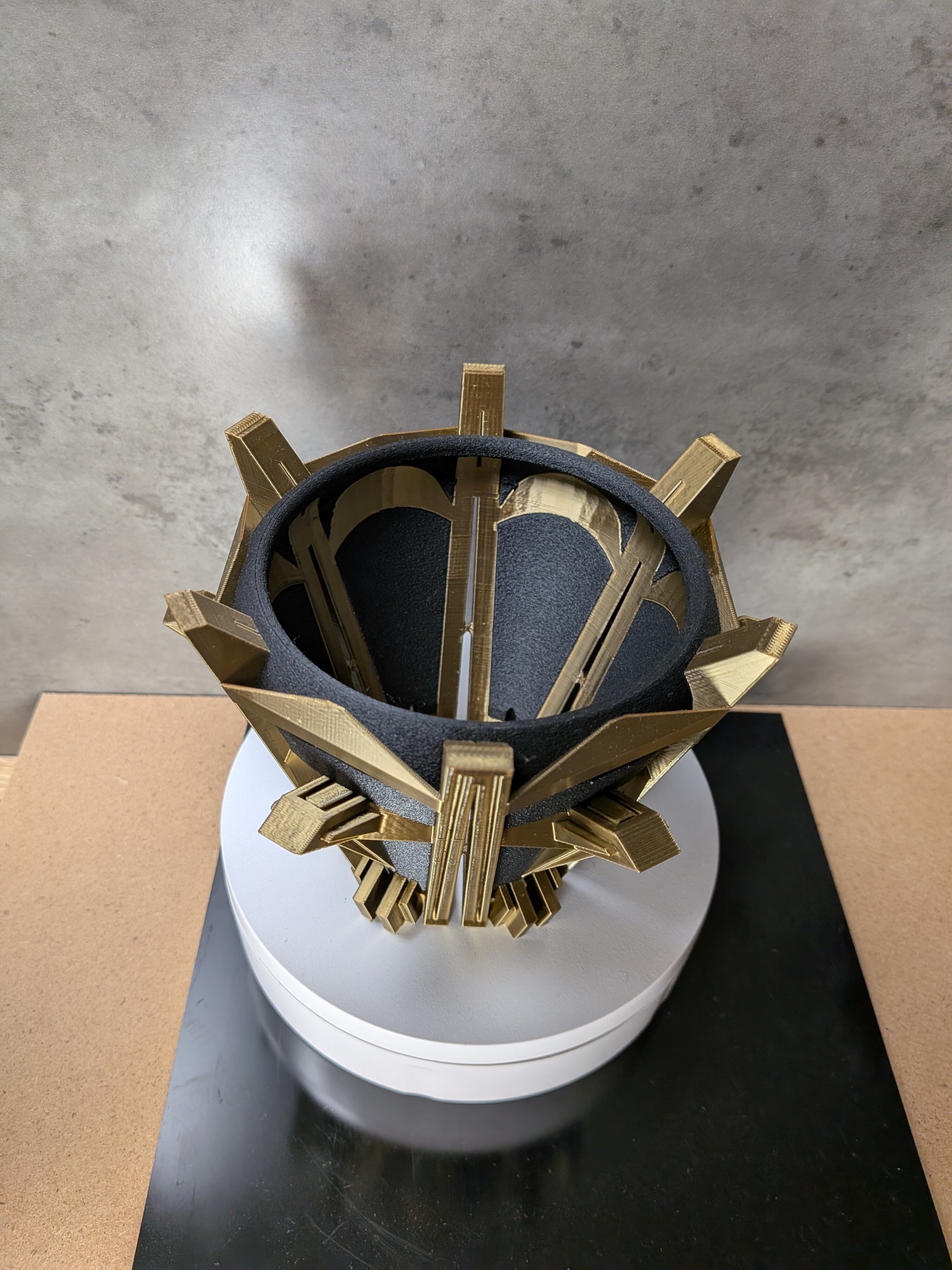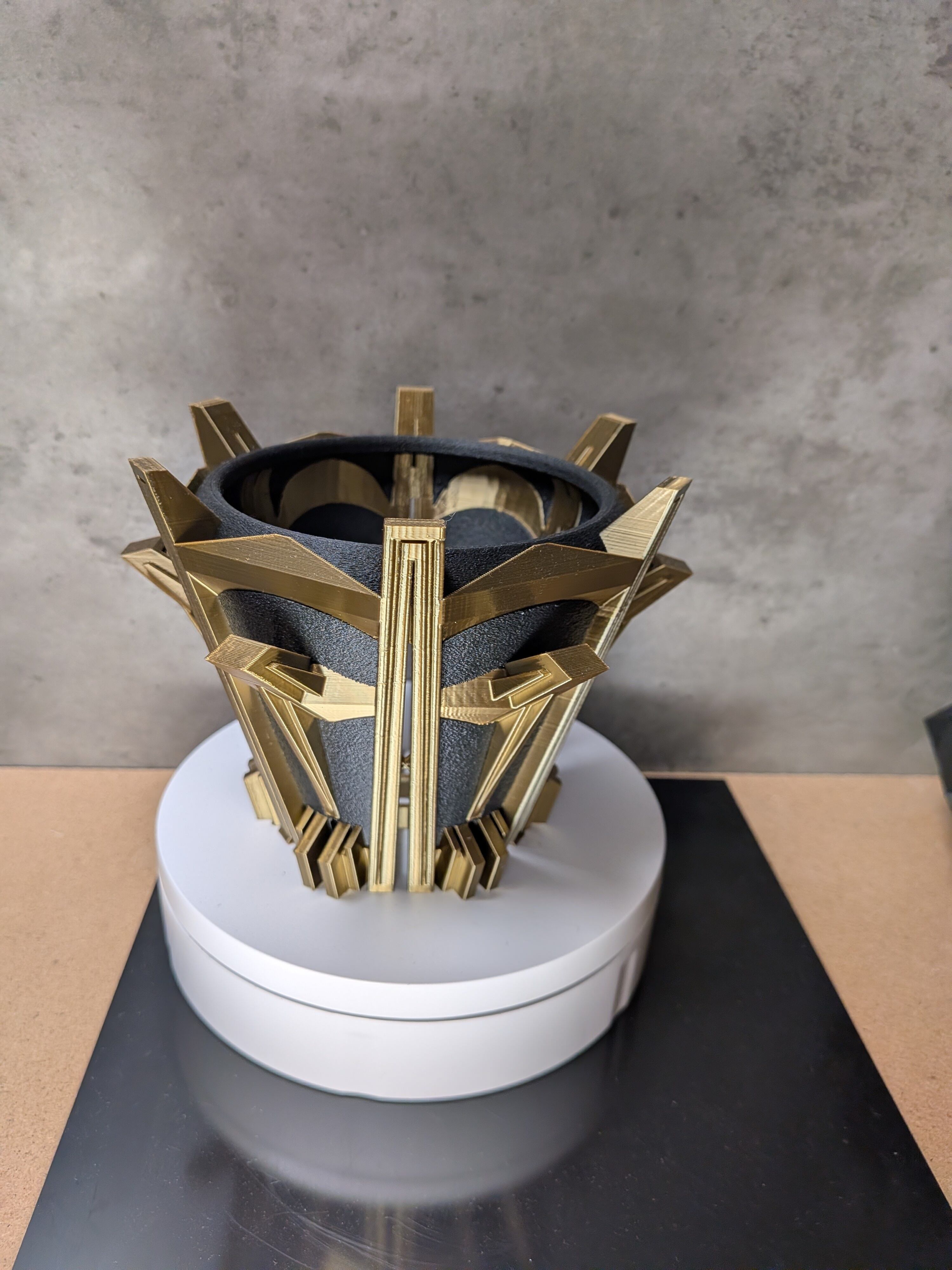 インスピレーションの源は、直線が支配する建築空間。かつて誰も見たことのないほど強烈なスリットを実現するため、無数の柱を立てるという結論に至りました。柱と柱を繋ぐ梁、ザラついた質感とシャープな直線の対比。俯瞰すれば、それは王の冠のようにも見えます。圧倒的な機能性が、アートピースとして昇華した3Dプリンター作家鉢です。